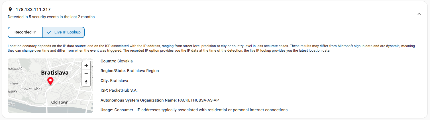 - You can choose to view the details of the IP address at the time the security event was detected by our systems (Recorded IP), or the updated data in real time (Live IP Lookup).