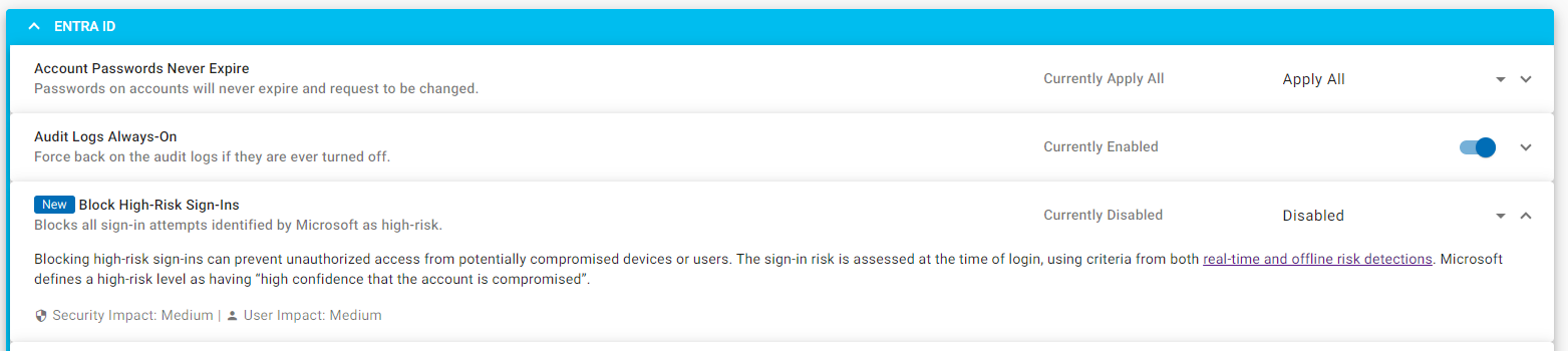 NOUVEAU Paramètre de sécurité! Uniquement disponible avec les licences Entra ID P2 (plan E5). Avant d'activer ce paramètre, veuillez vous assurer que vos utilisateurs aient les licences appropriées.